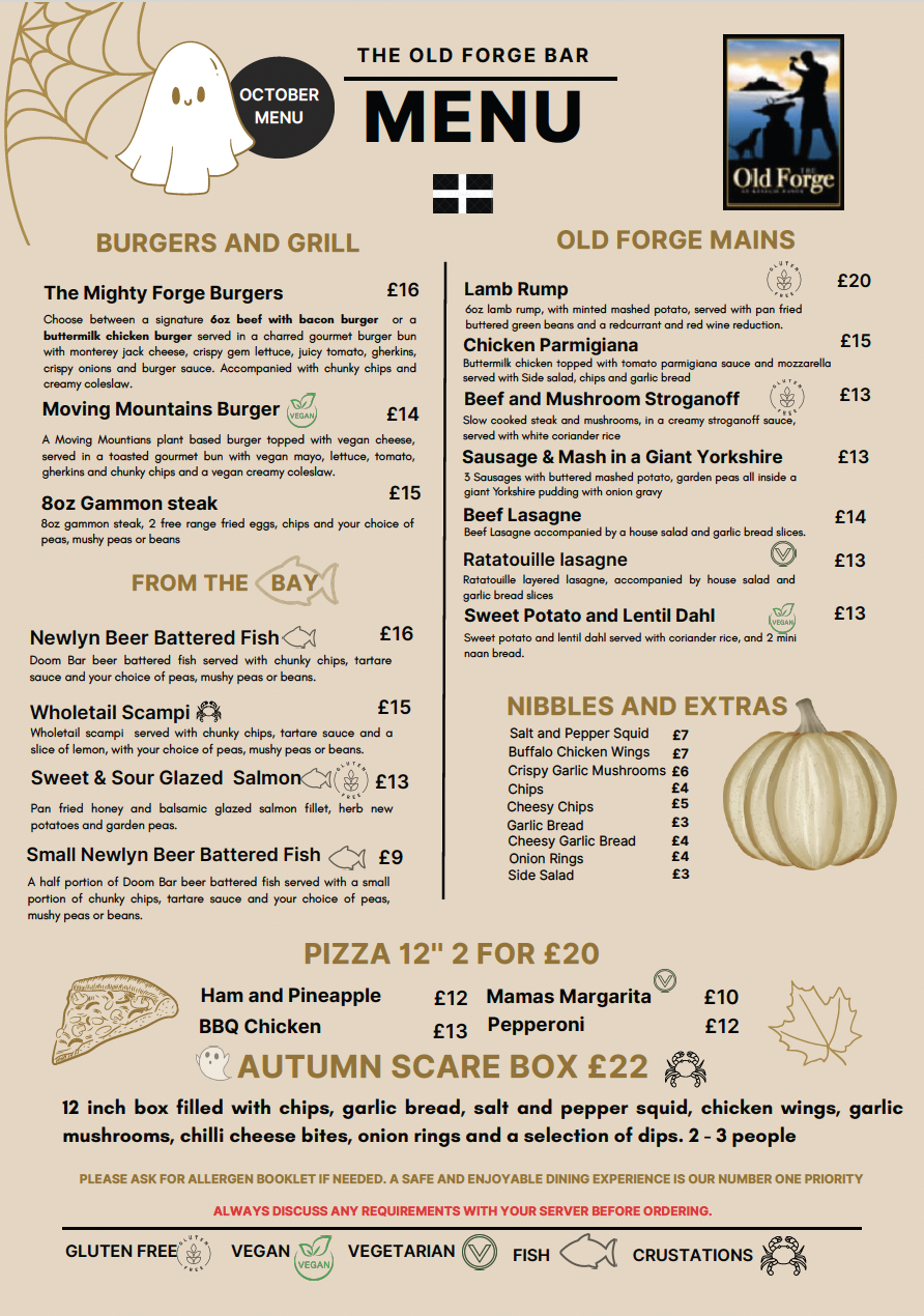 You can order a range of delicious freshly cooked food from the Old Forge main menu from only £13.00 or our kids menu from only £6.95 to enjoy in our refurbished restaurant and enjoy our weekly range of evening light fun activities.